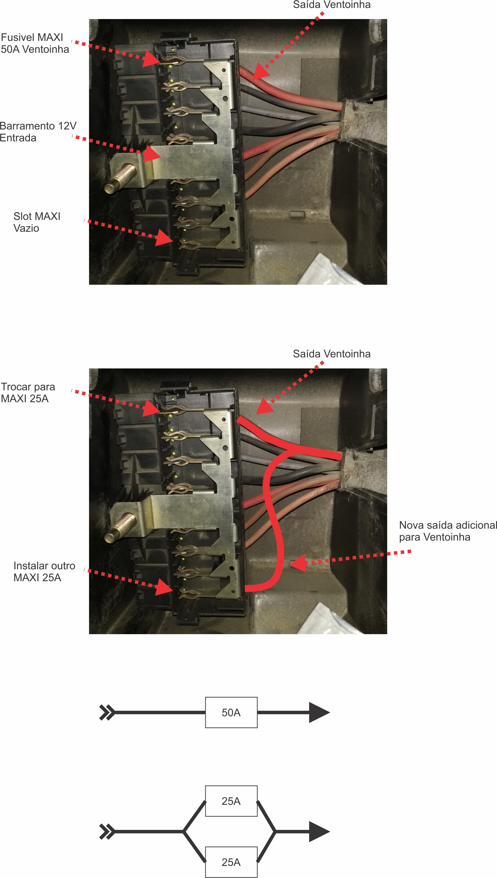 como? aproveite o barramento 12v original.. instale os 2 fusiveis de 25A.. aí na saída original do fusivel que vai pra ventoinha, divida ela por 2, com uma conexão em cada fusível.