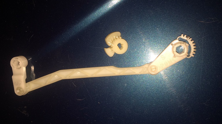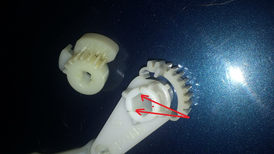 O braço articulado sai mais facilmente por cima. Por baixo é mais difícil. Ele está atrás de um dos dutos do sistema de climatização, do ar condicionado. Não tem erro na reposição. As engrenagens só funcionam se estiverem conectadas em uma posição. Vai ter que fazer mágica para montar em posição diferente. Atentar para o sincronizador delas, que é também de plástico e tem aparência frágil. Ver figura abaixo.