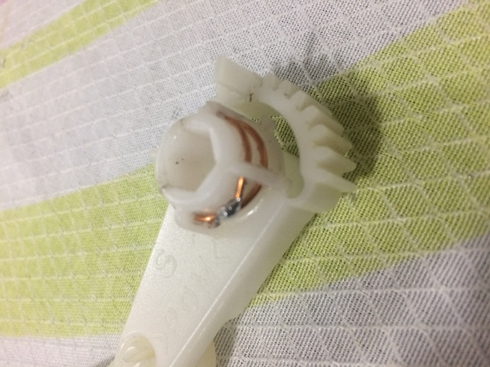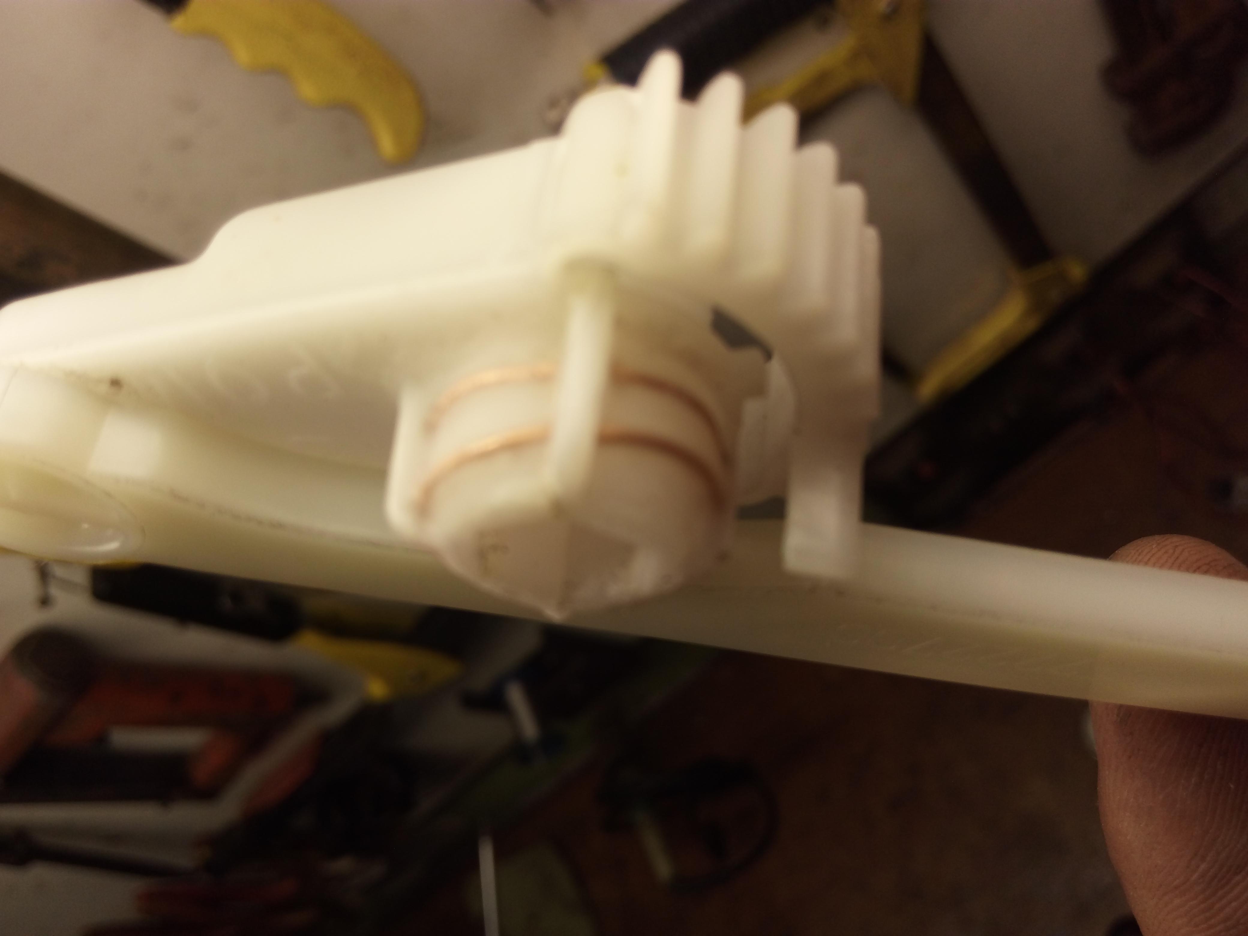 Os reforços foram feitos com fio de cobre daqueles que são utilizados para enrolamentos de motores a indução, mas pode ser utilizado o de instalação elétrica comum desde que seja único, não pode ser do tipo cabo lexível. Diâmetro máximo dele é de 0,5mm. Não pode ser muito fino, porque pode não aguentar o funcionamento e se romper com o tempo. Ou então pode ser usado o fio rígido que vem nos cabos coaxiais do tipo RG60, usados em tv a cabo por assinatura. Os furos no plástico foram feito com o auxílio de um pedaço do próprio fio a ser usado no reforço e aquecido na boca de um fogão à gás de cozinha. A finalização foi feita com o estanhamento e ferro de solda de 15W para impedir que com o tempo se solte. Cuidado na soldagem e na furação para não destruir a peça de plástico. Essa tarefa requer certa habilidade para brasagem em peças pequenas.