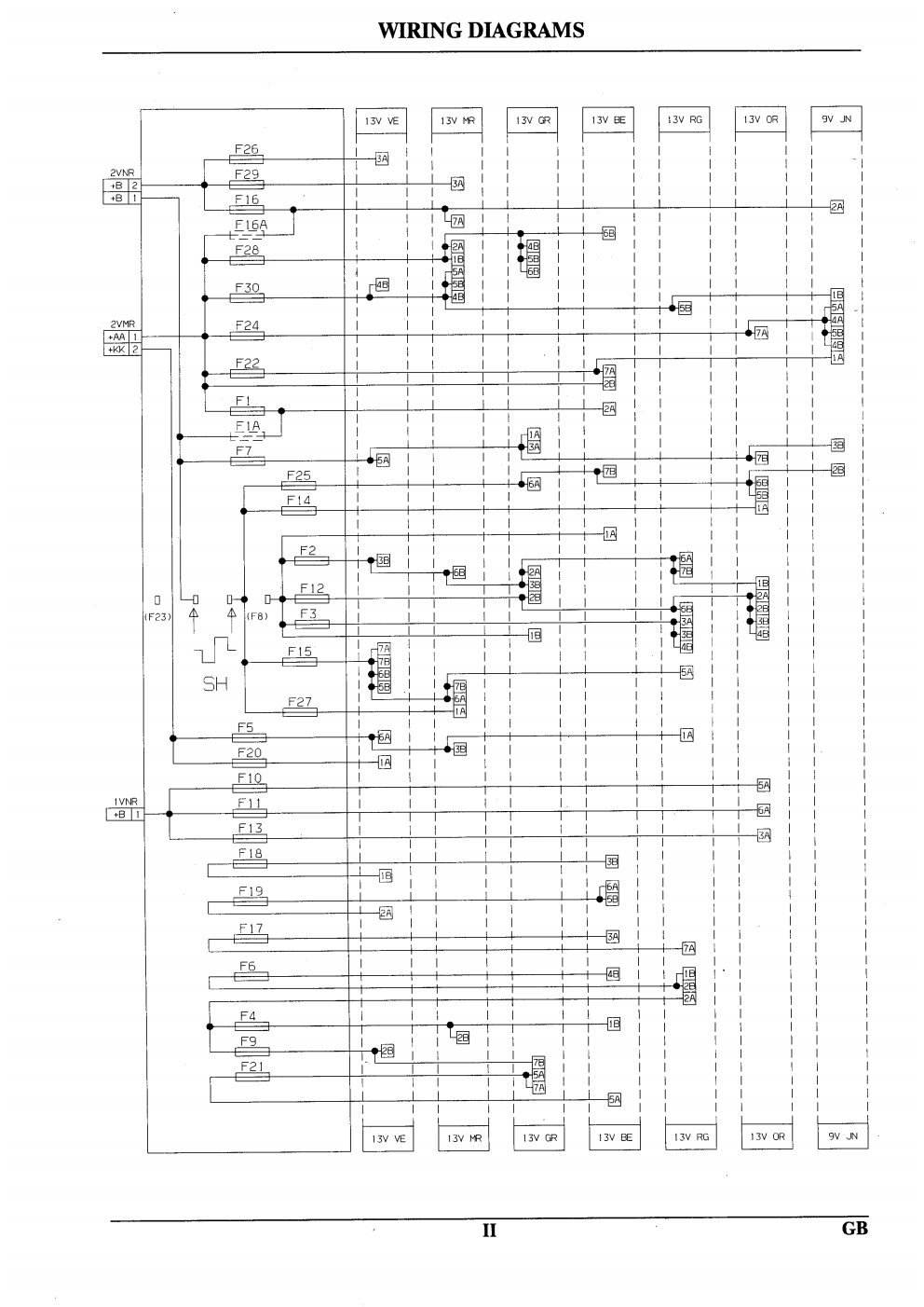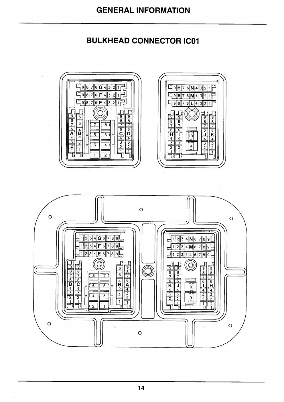 O diagrama abaixo é também igualmente dificil de ser encontrado. Trata-se do conector conhecido como Bulkhead Connector (IC01 nos diagramas) de 133 pinos. Responsavel por levar toda a informação da região do motor e da caixa de fusivel BF01) pra dentro da cabine, ele recebe a fiação que passa pelo paralamas, entra embaixo da churrasqueira e entra no habitáculo direto para a caixa de fusivel BF00 e segue adiante. É um conector muito bem construido e selado, preso por 2 parafusos torx no centro do terminal. Para acessa-lo é necessario remover a churrasqueira e uma cobertura de plastico que o protege da chuva e da sujeira.