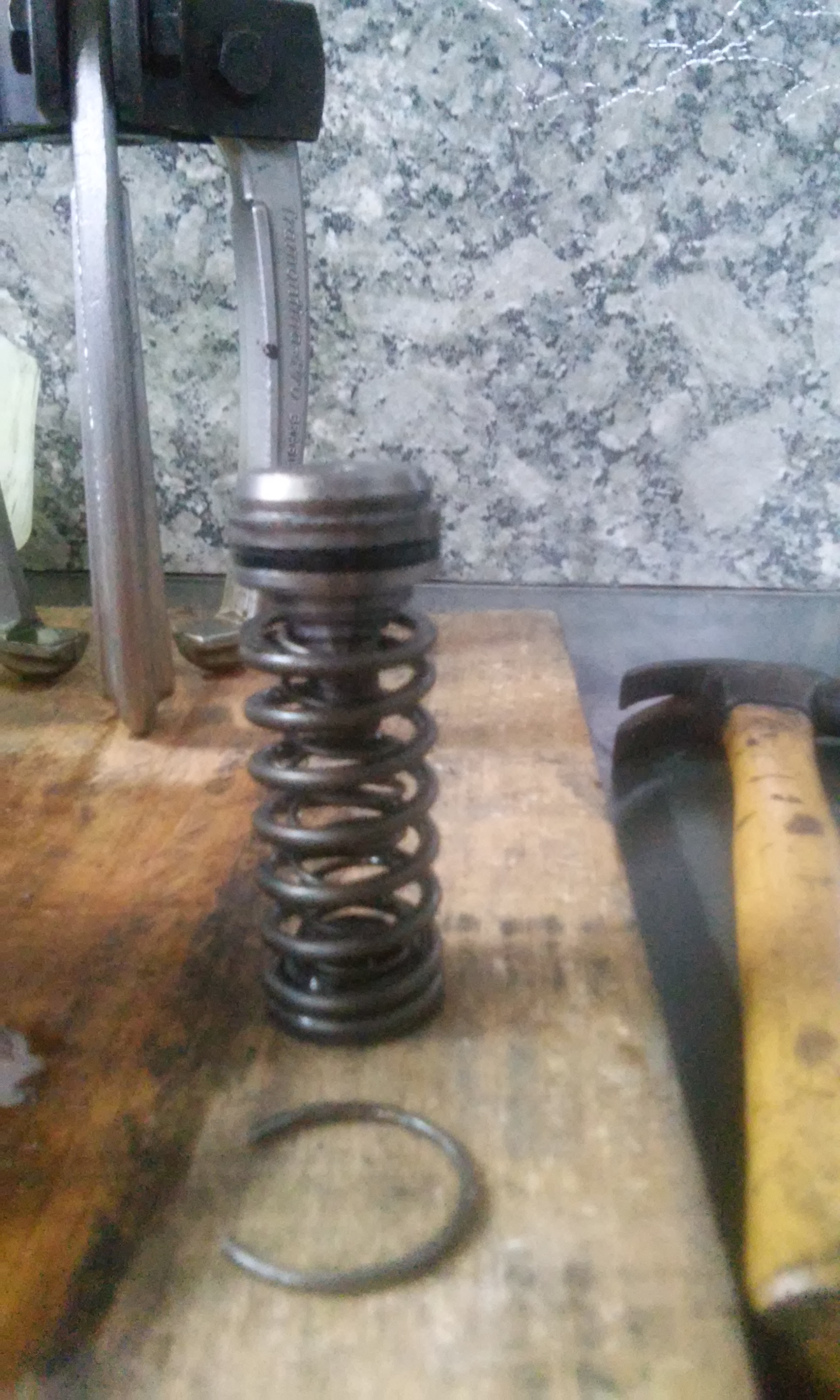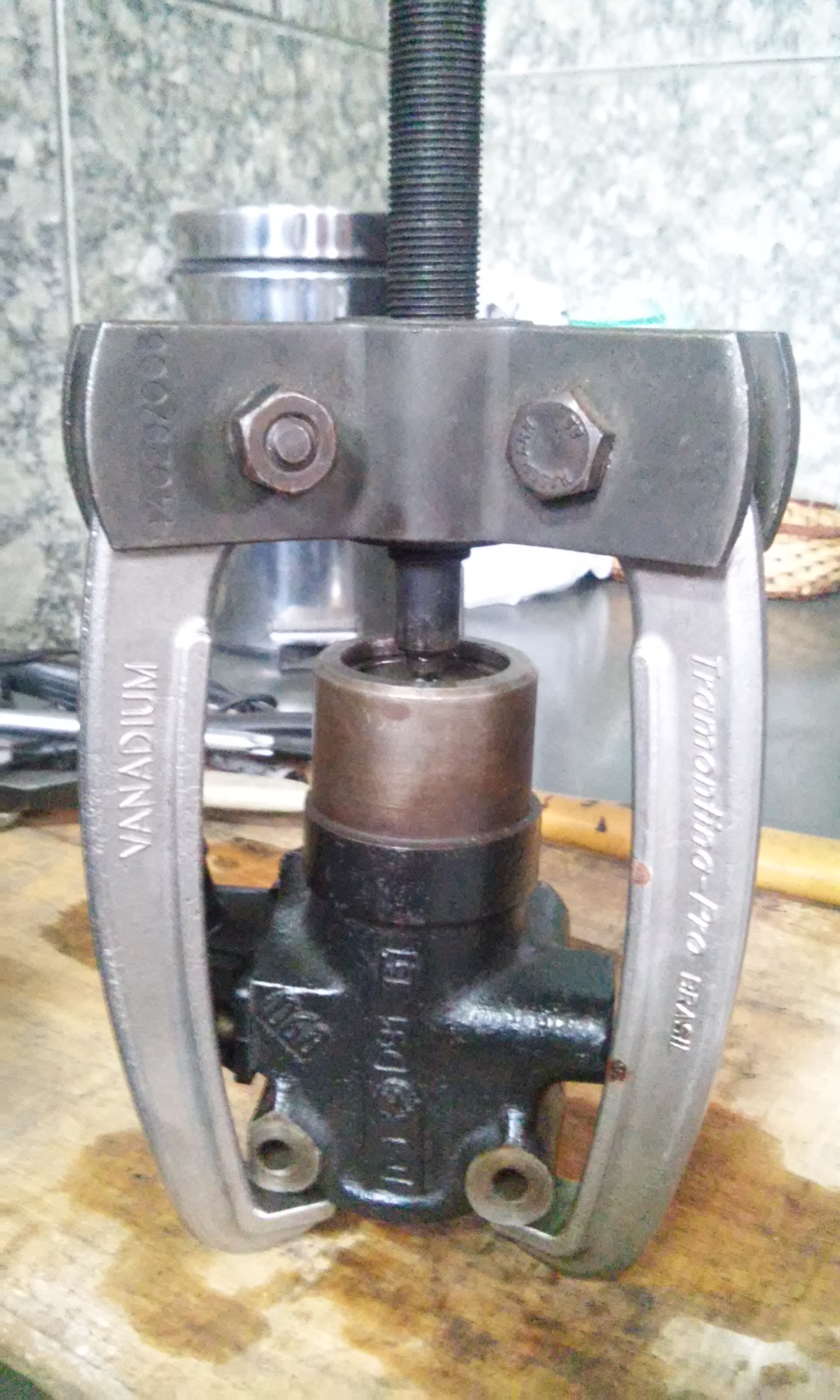 1 - Como não tenho um torno, resolvi usar o saca-polia bem fechado para empurrar a peça central e deixar a trava à mostra;