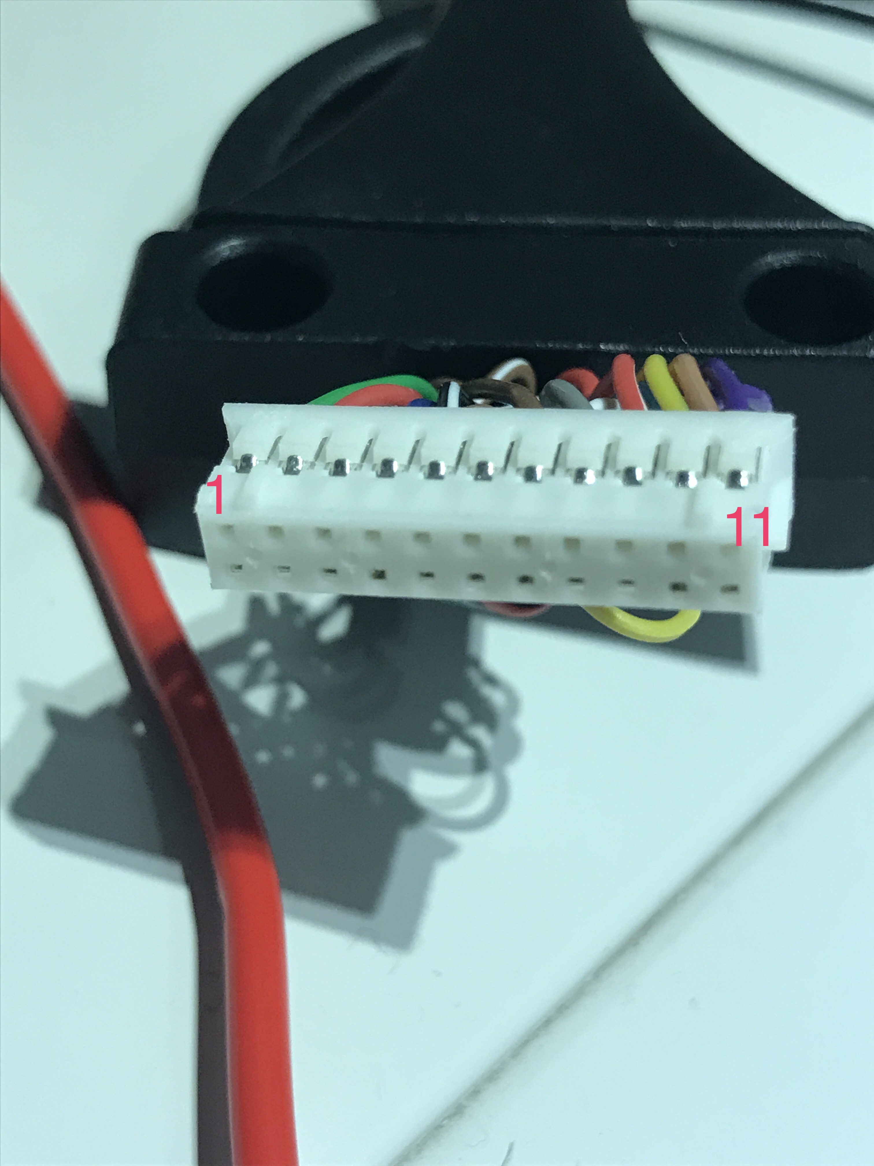 Olhando o conector do PCB com as travas para cima, numerando de 1 a 11 como na foto abaixo: