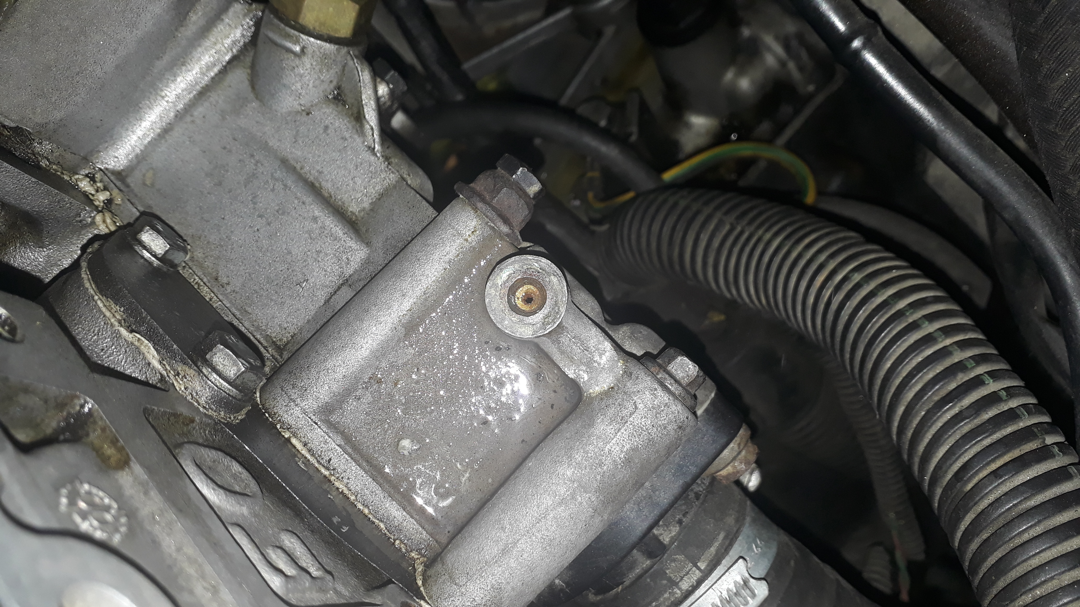 Ahh. Parece que colocaram cola de junta. Inclusive colocaram no cavalo d'água também. E tem gambiarra de parafuso maior que o normal, com uma porca de espaçador.