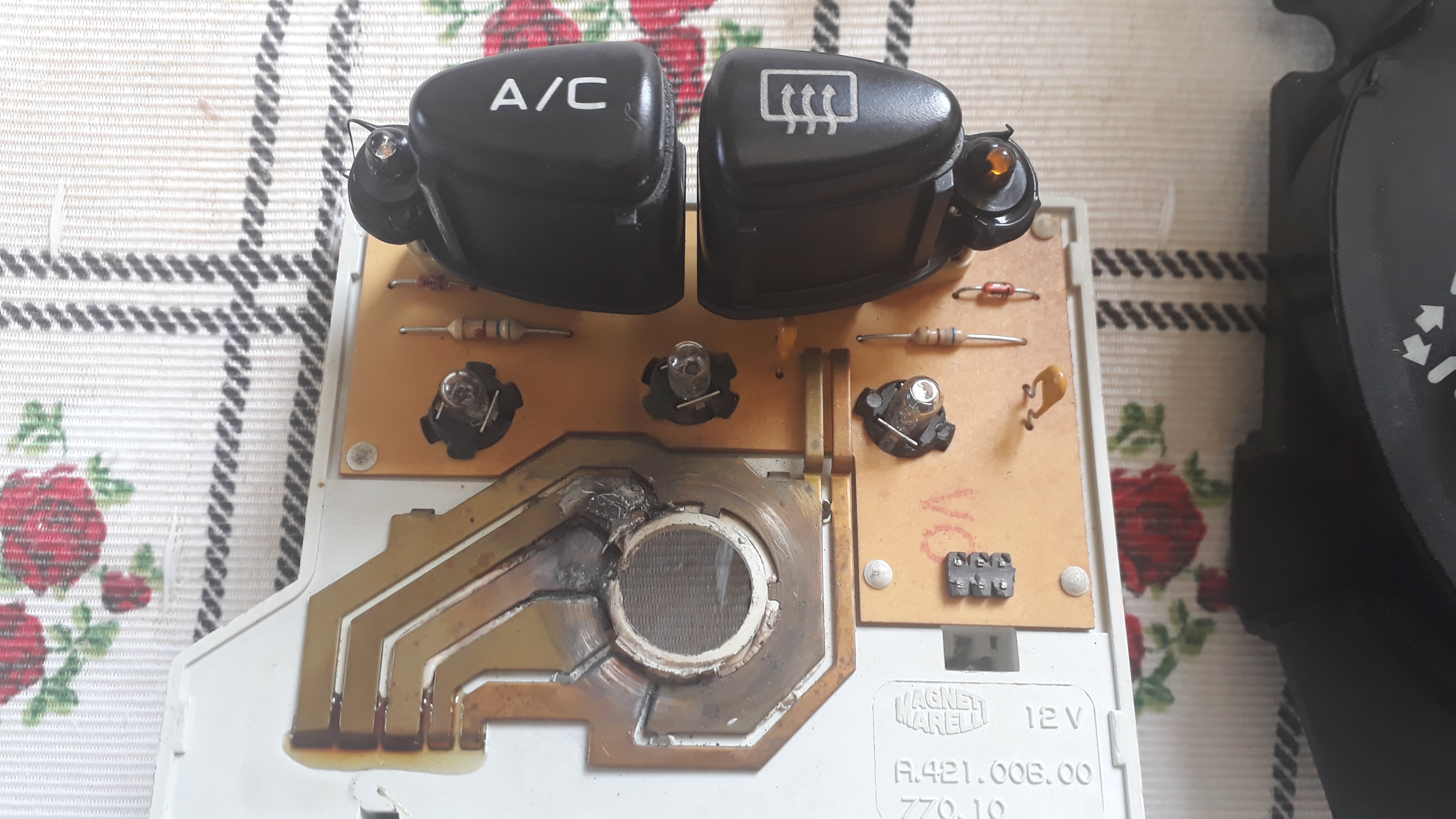 Procurei novamente por fuziveis queimados e nada.. Tudo perfeito. Resolvi então mais uma vez revisar o conector do comando do ventilador no painel. Tudo normal. Só restava retirar o comando do painel abrir e ver se o defeito era dentro. E. Bingo. Vejam as imagens.