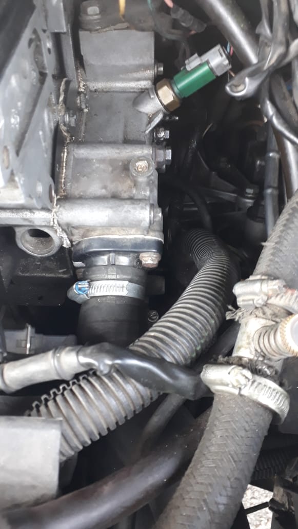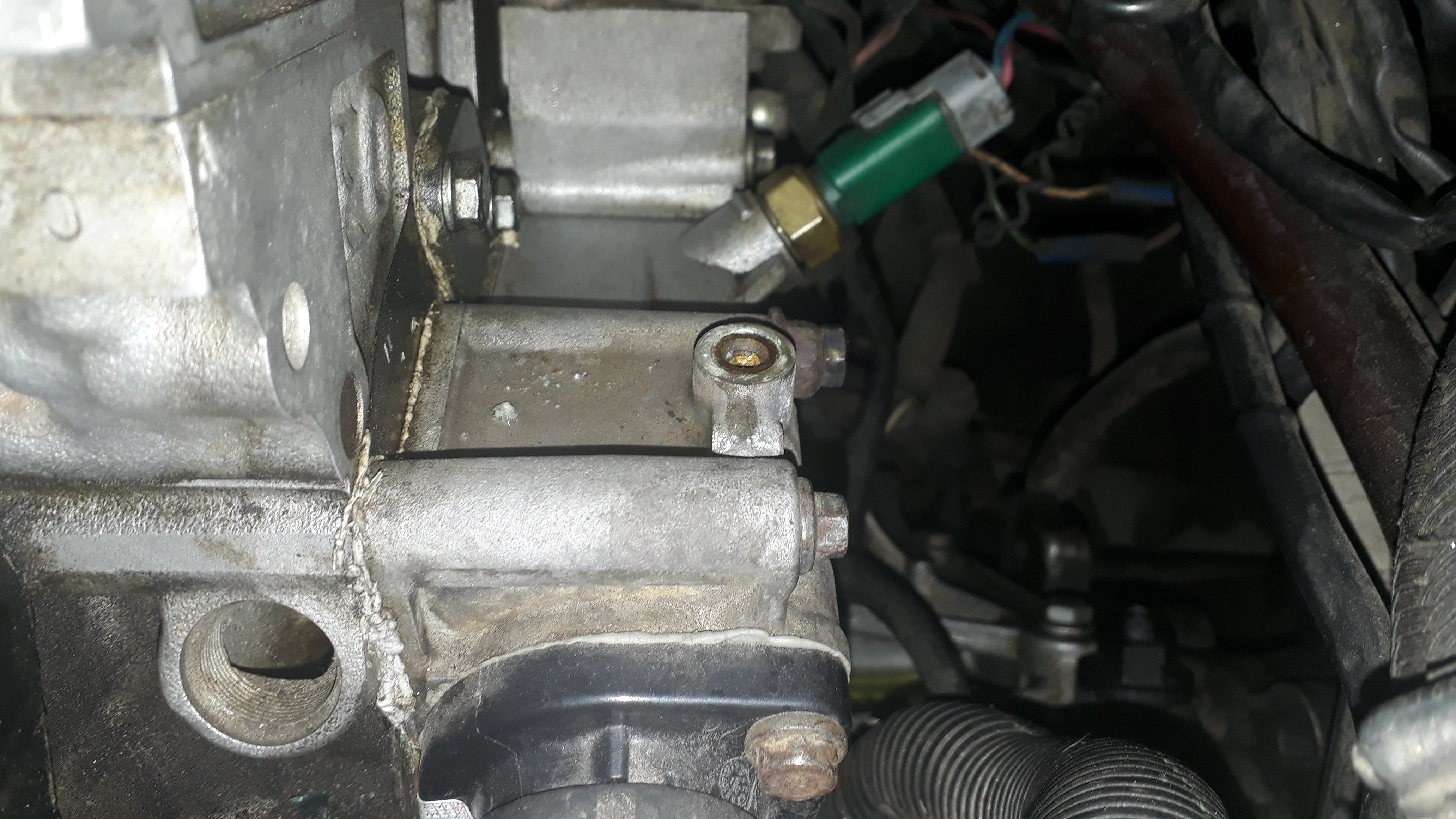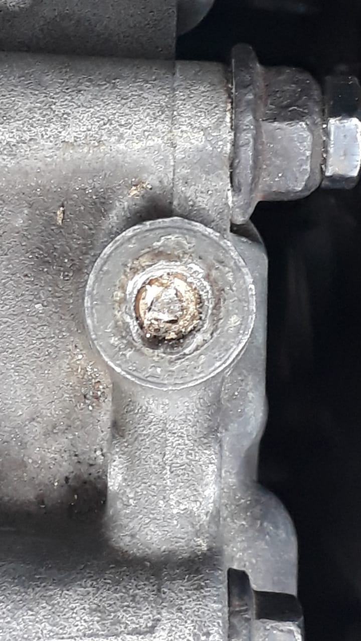 Ahh. Parece que colocaram cola de junta. Inclusive colocaram no cavalo d'água também. E tem gambiarra de parafuso maior que o normal, com uma porca de espaçador.
